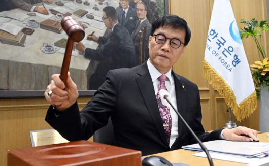 이창용 한국은행 총재가 29일 오전 서울 중구 한국은행에서 열린 금융통화위원회 회의에서 의사봉을 두드리고 있다. 이 총재는 이날 기준금리를 연 2.5%로 인하한다고 발표하며 “금리를 너무 빨리 낮추면 (유동성이) 경기 부양보다 자산 가격으로 막 흘러 들어가 코로나19 때 했던 실수를 다시 반복할 가능성이 굉장히 크다”고 말했다. 사진공동취재단 |