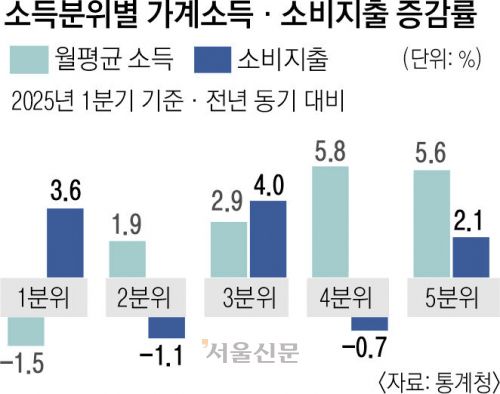 지난해 연말 비상계엄 사태와 미국 관세정책 등에 따른 경기 불확실성 확대로 고소득층을 중심으로 소비 심리가 위축됐다는 게 정부의 설명이다. 통계청 관계자는 “1분기 한국은행 소비자심리지수가 좋지 않았다”면서 최근 3개 분기를 보면 소득과 비교해 소비 위축이 심화하는 모습이라는 취지로 설명했다.