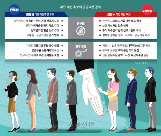 공약집에는 당근책도 일부 포함됐다. 이 후보는 노조의 공공기관 경영 참여를 보장하는 ‘노동이사제’를 도입하고, 공직자의 업무시간 외 직무와 무관한 정치활동을 보장하겠다고 공약했다. 김 후보는 저연차 신혼부부 공무원을 위한 임대주택 5000가구를 공급하고 무주택 공무원에게 주택 구입 이자를 보전하겠다고 했다.