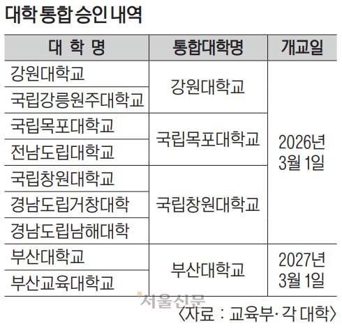 교육부는 강원대가 국립강릉원주대와, 국립목포대가 전남도립대와, 국립창원대가 경남도립거창대·경남도립남해대와 통합하는 3건의 대학 통합을 승인했다고 29일 밝혔다. 부산대와 부산교육대 통합은 30일 승인한다.