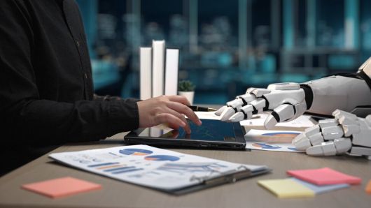 인간의 손과 로봇의 손이 협업하는 모습을 통해 테크놀로지와 인간 능력의 결합을 보여주는 사진. 영국 학자들이 쓴 ‘AI는 인간을 먹고 자란다’는 인공지능이 인간의 노동력과 지능을 뽑아내 기업의 이익으로 돌리는 구조를 비판한 책이다. 게티이미지뱅크 |
