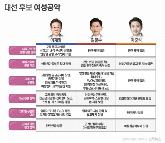 김문수 후보는 △현행 공무원 규정인 '양성평등 채용 목표제'를 공공기관에 확대 적용 △'WOW 프로젝트'(경력단절 여성 복귀) △'부분근로자 대표제' 도입 등을 제시했다. 하지만 임금격차 등 구조적 성차별 해소보다는 실무 개선 수준에 머문다는 지적이다.