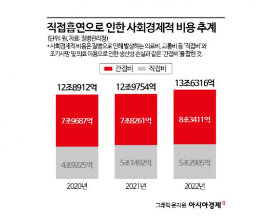 직접흡연으로 인한 직·간접 사회경제적 비용은 2020년 12조8912억원, 2021년 12조9754억원, 2022년 13조6316억원으로 추산됐다. 사회경제적 비용이란 질병으로 인해 발생하는 의료비, 교통비 등 직접비와 조기사망 및 의료이용으로 인한 생산성 손실과 같은 간접비를 합한 비용이다.