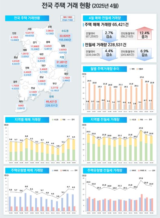 30일 국토교통부가 발표한 '2025년 4월 기준 주택 통계'에 따르면 지난달 말 기준 전국 주택 매매거래량은 6만5421건으로 집계됐다. 지난 3월 6만7259건과 비교하면 2.7% 감소한 수치다. 다만 1년 전인 2024년 4월(5만8215건)과 비교하면 12.4% 늘었다.