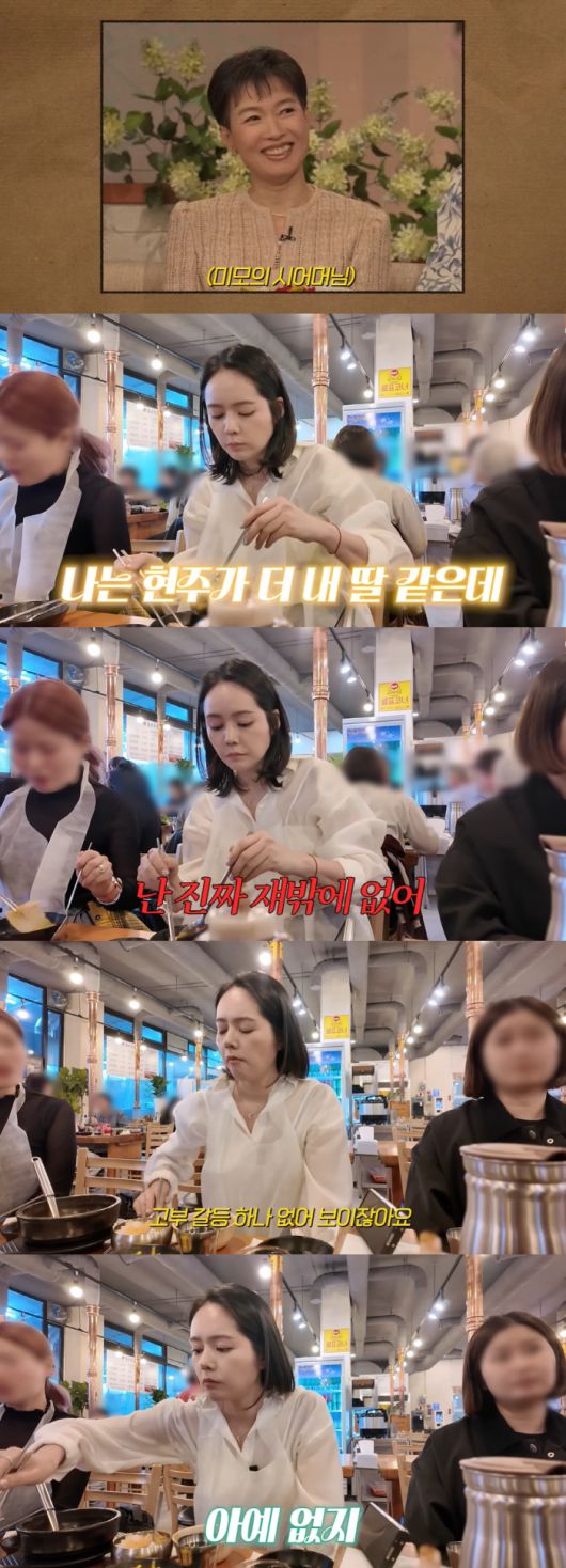 대신 22년 전 TV 출연 모습이 공개됐다. 시어머니는 "미디어에 한 번도 출연한 적 없냐"는 질문에 22년 전 KBS '아침마당'에 아들 배우 연정훈, 남편 배우 연규진과 함께 출연한 적 있다고 전했다. 당시 화면 속 시어머니는 우아하고 기품 있는 미모를 자랑했다.