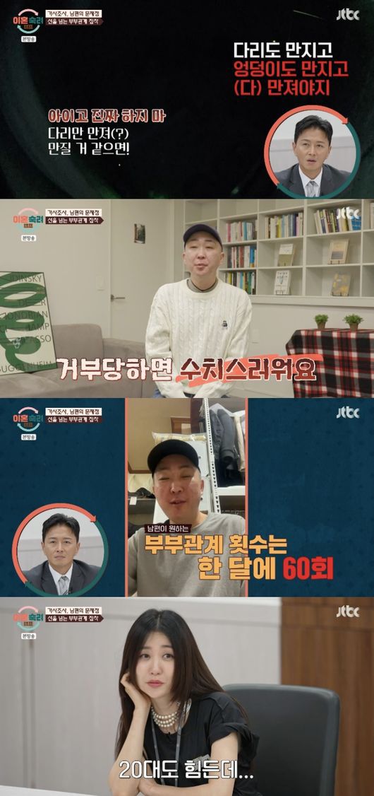 가장 먼저 아내 측 증거부터 공개됐다. 아내는 남편의 문제점으로 과도한 스킨십을 언급했다. 남편은 틈만 나면 부부관계를 원했고, 특히 엉덩이에 집착하는 모습을 보여 모두를 경악케 했다.