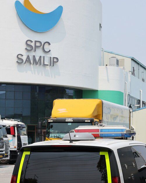 27일 경기도 시흥시 SPC삼립 시화공장에서 경찰 과학수사대 차량이 합동감식을 위해 이동하고 있다. 앞서 지난 19일 오전 3시께 SPC삼립 시화공장에서 50대 여성 노동자가 냉각 컨베이어 벨트에서 윤활유를 뿌리는 작업 중 기계에 상반신이 끼이는 사고로 숨졌다. 연합뉴스 |