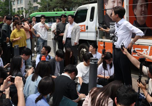 지난 28일 낮 서울 여의도공원에서 열린 이준석 개혁신당 대통령 후보 유세 현장에서 한 여성(노란 옷)이 전날 밤 21대 대통령선거 후보자 3차 티브이(TV) 토론회에서 나온 이 후보 발언에 대해 항의하고 있다. 백소아 기자 thanks@hani.co.kr |