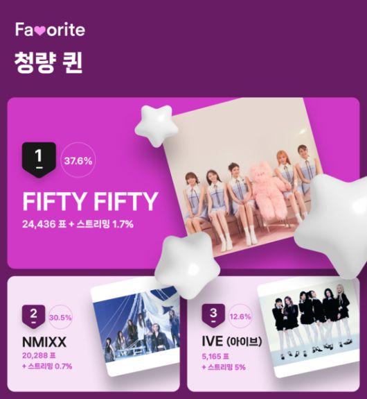 상큼하고 시원한 매력으로 다가오는 여름을 책임질 청량 여자 아이돌을 뽑는 투표에서 FIFTY FIFTY가 1위에 선정되었다.