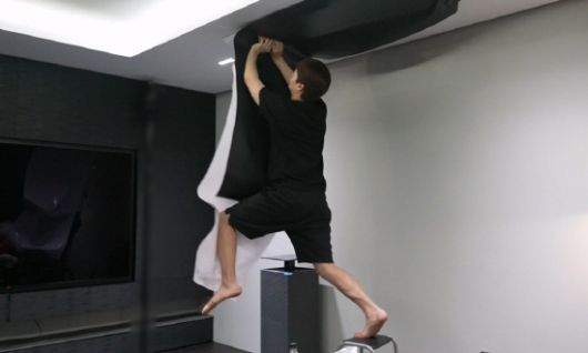 에어컨의 사이즈를 측정하던 그는 결심을 한 듯 두 손에 블랙 시트지를 펼쳐 들고 의자에 올라 '무한 점프'를 시도한다.