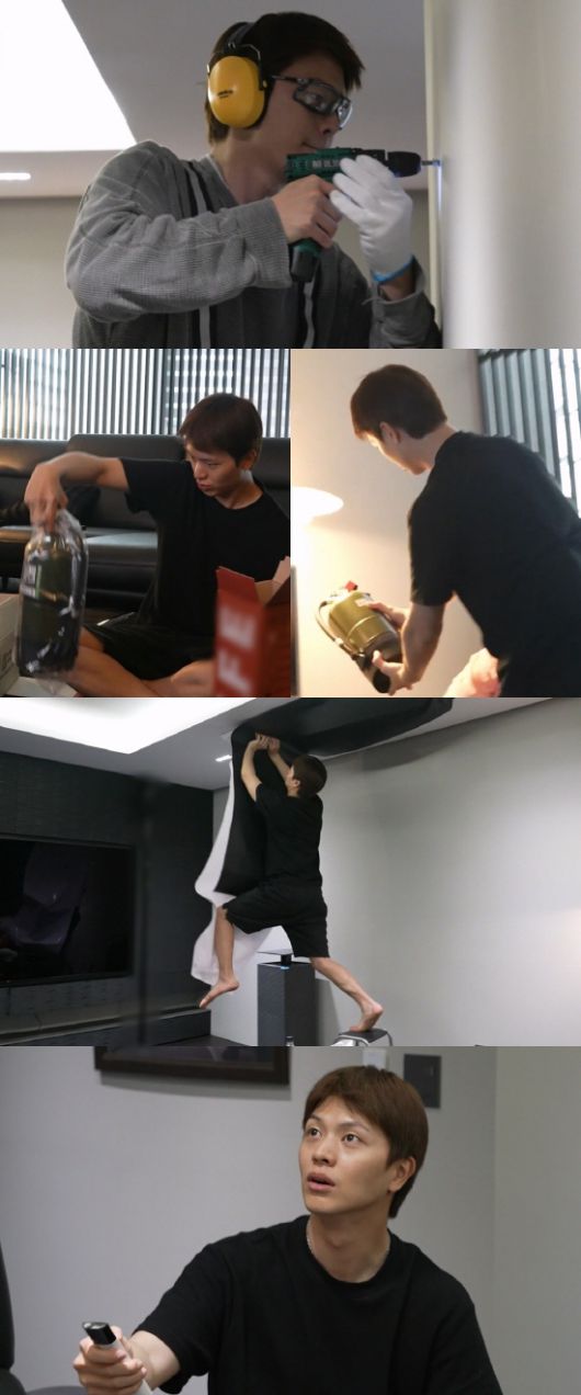 육성재가 귀마개에 고글까지 장착하고 전동드릴로 벽을 뚫는 모습도 포착됐다. 자신의 집 벽에 처음으로 구멍을 뚫어본다는 육성재는 호기로운 마음으로 작업을 시작한다.