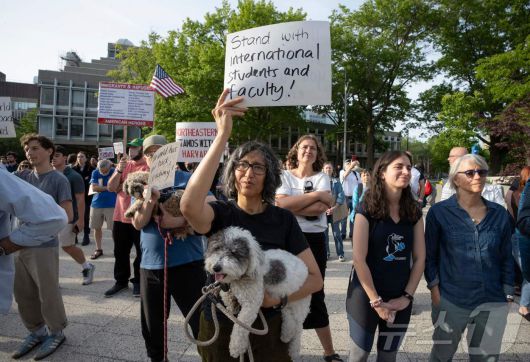 27일(현지시간) 미국 매사추세츠주(州) 보스턴에 있는 하버드 대학교 캠퍼스에서 유학생을 지지하는 집회가 열렸다. 한 집회 참여자가 '국제 유학생과 교수진과 함께한다'는 플래카드를 들고 있는 모습. 25.05.27 ⓒ AFP=뉴스1 ⓒ News1 김예슬 기자 |