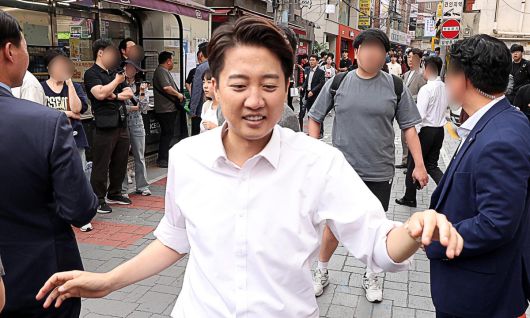 이준석 개혁신당 대선후보가 29일 서울 성북구 고려대 정경대 후문에서 유세를 마치고 인증샷을 찍고 있는 가운데 대학생이(뒤) 이 후보가 TV토론 당시 여성 신체 부위 언급 것 등에 대해 항의를 하고 있다. 뉴시스 |