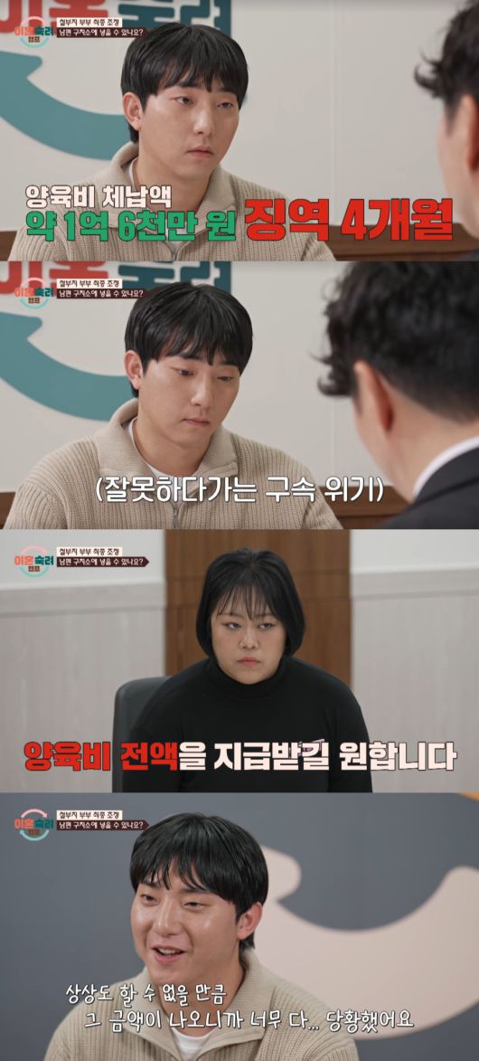 구속 위기 가능성도 생긴 남편은 미지급 양육비가 4천4백만 원이라는 말에 놀라움을 표했다. 전액 지급을 원하는 아내에 남편은 "놀라서 말이 안 나왔다. 상상할 수 없는 금액이 나오니 당황했다"고 고백했다.