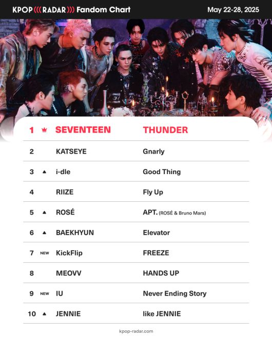 '케이팝레이더'는 30일 한 주간 팬덤 지표 증감률을 바탕으로 아티스트의 성장세를 분석한 위클리 팬덤 차트 결과를 발표했다. 이번 주 차트에서는 세븐틴이 지난 26일 발매한 정규 5집 '해피 벌스트데이(HAPPY BURSTDAY)'의 타이틀곡 '썬더(THUNDER)'로 정상을 차지했다.