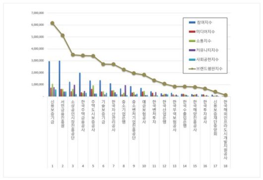 금융 공공기관 브랜드평판 분석은 참여지수, 미디어지수, 소통지수, 커뮤니티지수, 사회공헌지수로 구분하여 브랜드평판지수를 산출했다.