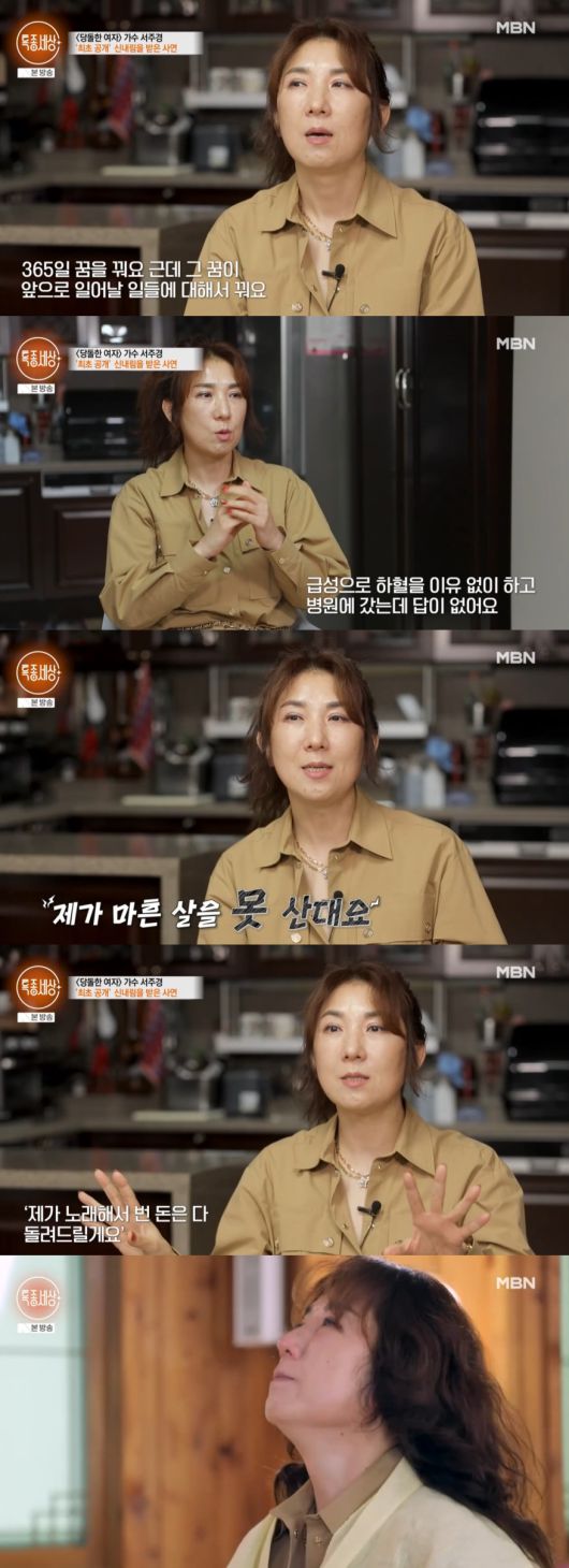 또한 난치성 희귀병을 물려받은 서주경은 "꿈 일지를 쓸 정도로 365일 꿈을 꾼다. 앞으로 일어날 일들에 대한 꿈을 꾼다. 급성으로 이유 없이 하혈을 해서 병원에 갔는데 답이 없더라. 그리고 혼자 중얼거리고 자꾸 옆에서 누가 말을 하는데, 마흔을 못 넘긴다고 하더라. 무서웠다"며 이유없는 고통을 겪었던 과거를 회상했다.