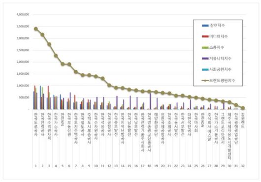 2위, 한국전력공사 브랜드는 참여지수 996,732 미디어지수 533,755 소통지수 949,602 커뮤니티지수 667,388 사회공헌지수 12,419가 되면서 브랜드평판지수 3,159,896으로 분석됐다. 지난 4월 브랜드평판지수 2,326,644와 비교해보면 35.81% 상승했다.