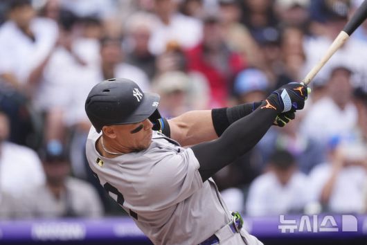 [덴버=AP/뉴시스] 뉴욕 양키스의 애런 저지가 지난 25일(한국 시간) 미국 콜로라도주 덴버의 쿠어스필드에서 벌어진 2025 메이저리그(MLB) 콜로라도 로키스와의 경기에서 1회초 솔로 홈런을 때려내고 있다. 2025.05.25 |