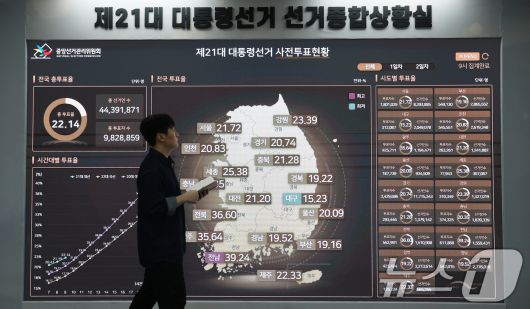 제21대 대통령선거 사전투표 둘째 날인 30일 오전 경기도 과천 중앙선거관리위원회 선거종합상황실 대형 전광판에 동시간대 투표율을 비롯한 사전투표율 현황이 표시되고 있다. 2025.5.30/뉴스1 ⓒ News1 오대일 기자 |