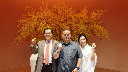 [지난 4월 11일 더샵 일산엘로이 펜트하우스 견본주택에 방문한 폴포츠(가운데)와 시행사 와이에스디엔씨 채윤석 회장(좌), 인테리어 설계 스페이스 플래너 박선화 대표(우) ] |