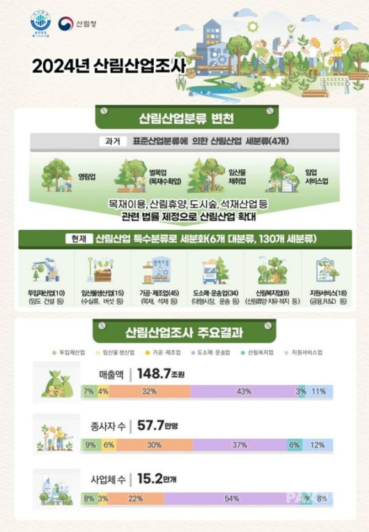 올해는 국가승인통계 지정 후 두 번째 결과 발표로, 산림산업 전체 매출액은 148조7000억 원으로, 전년도 146조2000억 원 대비 1.7%인 2조5000억 원 증가했습니다.
