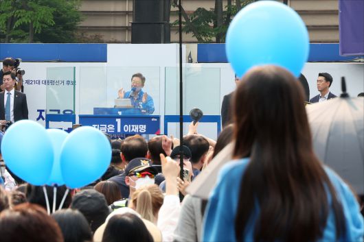 이재명 더불어민주당 대선 후보가 28일 오후 서울 광진구 어린이대공원 정문 앞에서 선거유세를 하고 있다. 박민규 선임기자 |