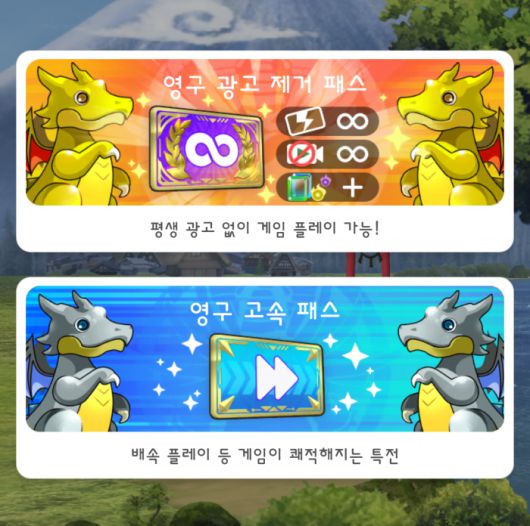 유로 아이템으로는 ‘영구 광고 제거 패스’와 ‘영구 고속 패스’ 2종류가 있다. ‘영구 광고 제거 패스’를 구입 시 ‘스태미나 티켓’이 무한으로 변경되며, 크리스털의 드롭률과 결과 획득 보상(마나, 크리스털)이 광고 시청을 하지 않아도 항상 2배가 된다. 또한 크리스털의 소지 한도가 50에서 500으로, 마나 소지 한도가 99만9999에서 최대 9999만9999로 증가한다.