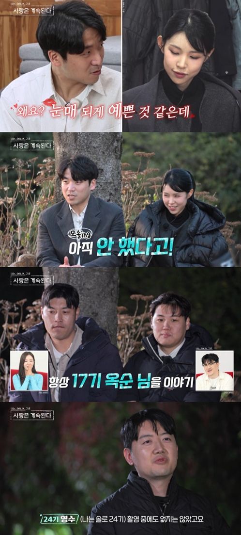 그런가 하면 ‘남남 커플’이 된 23기 영호는 ‘17기 옥순 바라기’ 25기 영철에 대해 “방송에서 이상형 물어보면 항상 17기 옥순님을 얘기했다”고 대신 어필했고, “운동하면서 한 가지만 목표하며 살았기 때문에 절대로 단념하지 않는다”라고 17기 옥순을 향한 집념을 강조했다.