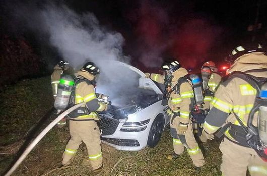 지난해 11월 8일 충남 서산시의 한 공터에서 불에 타 발견된 승용차. 강도살인 혐의로 기소된 김명현은 당시 도박 빚을 갚기 위해 40대 남성을 살해한 뒤 증거를 없애기 위해 차량에 불을 질렀다. [사진 서산소방서] |