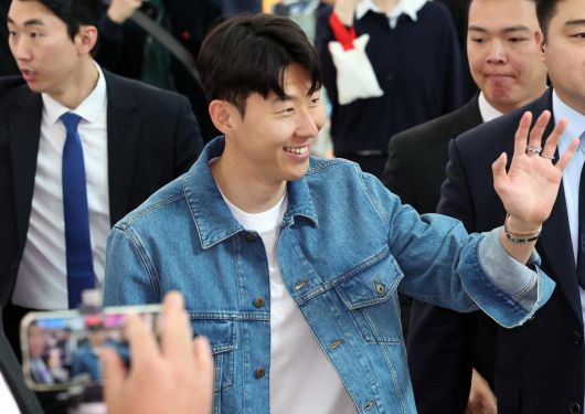 유럽축구연맹(UEFA) 유로파리그 우승 후 홍명보 감독이 이끄는 축구대표팀에 선발된 손흥민이 27일 오후 인천국제공항으로 귀국하며 팬들에게 인사를 하고 있다. 뉴스1 |