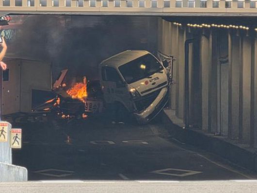 6일 오전 김문수 국민의힘 대선 후보의 유세 차량이 서울 용산구 갈월지하차도에서 전도돼 화재가 난 모습. 온라인 커뮤니티 캡처 |
