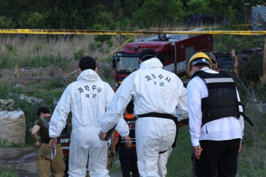 군 항공사고 조사관들이 30일 오전 경북 포항시 남구 동해면 야산에 추락한 해군 대잠 해상초계기 사고 현장 조사를 진행하고 있다. 연합뉴스 |