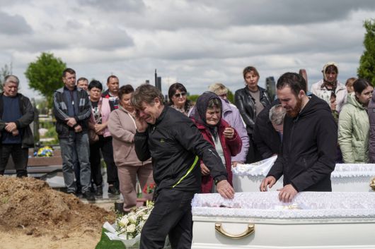 우크라이나 코로스티시우에서 28일(현지시간) 러시아 공습으로 사망한 사람들의 장례식이 진행되고 있다. 코르스티시우(우크라이나)/AP연합뉴스 |