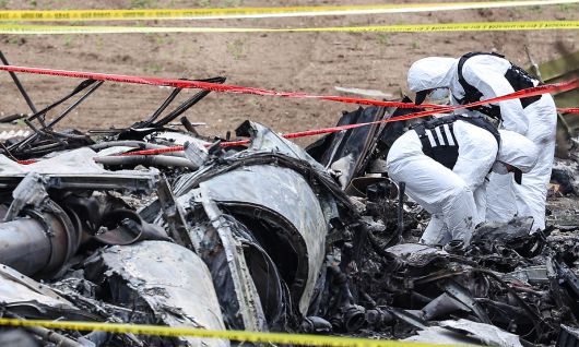30일 경북 포항시 동해면 해군 초계기 추락 현장에서 해군 관계자들이 현장 감식을 하고 있다. 연합뉴스 |