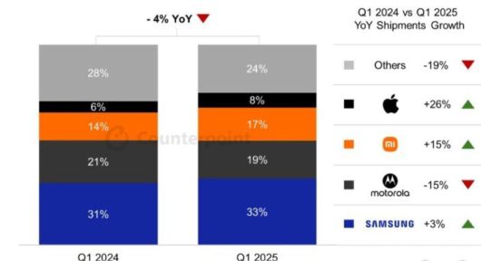 애플은 출하량이 26% 증가해 점유율 4위에 올랐으며, 비교적 저렴한 가격의 아이폰16e가 멕시코 등에서 인기를 끌었다. 반면 모토로라는 재고 증가로 신제품 출시를 연기하며 출하량이 15% 감소했다.