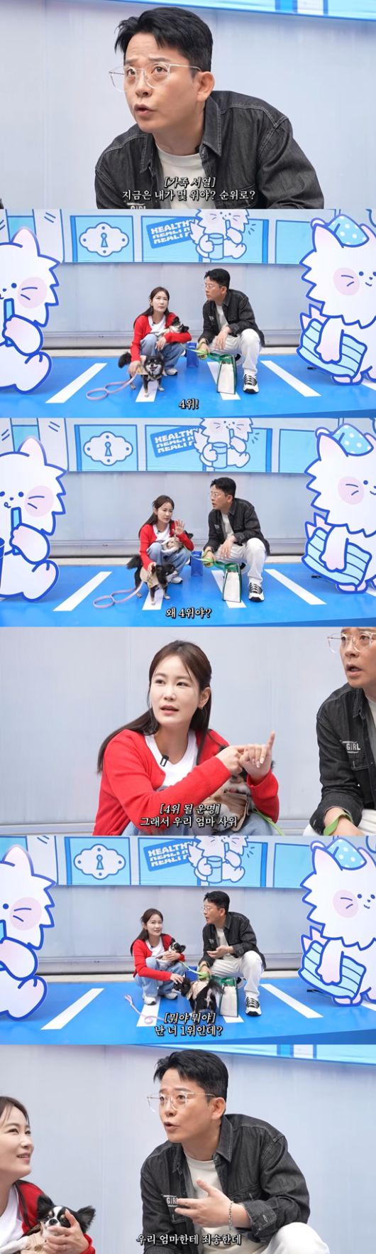 김지민은 반려견 느낌, 나리에게 애정을 쏟는 모습을 보여줬다. 그 모습을 보던 김준호가 김지민에게 "지금은 내가 (김지민에게) 순위로 몇 위냐"고 질문했다. 김지민은 "4위다. 느낌, 나리 1, 2위. 3위 엄마. (김준호는) 4위다. 그래서 우리 엄마 사위다"며 재치 있는 답변을 전했다.