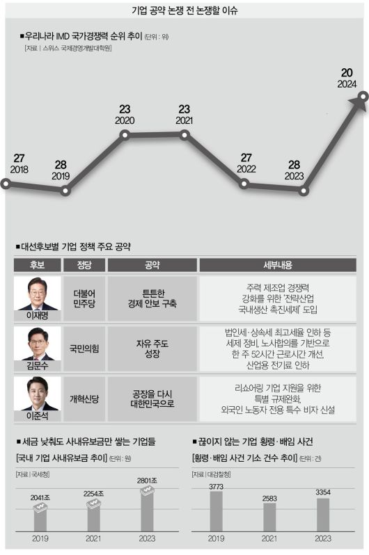 경기침체 장기화, 12·3 비상계엄 사태, 트럼프발 관세전쟁…. '조기早期'란 타이틀을 빼더라도 이번처럼 국내외 이슈가 많았던 대선은 없었다. 이 때문인지 6·3 대선에선 기업에 활력을 불어넣기 위한 정책과 공약이 쏟아져 나왔고, 그 중심엔 '감세'가 있었다. 문제는 세금만 깎아주면 '기업하기 좋은 나라'가 되느냐다. '공약논쟁前' 기업정책편이다.