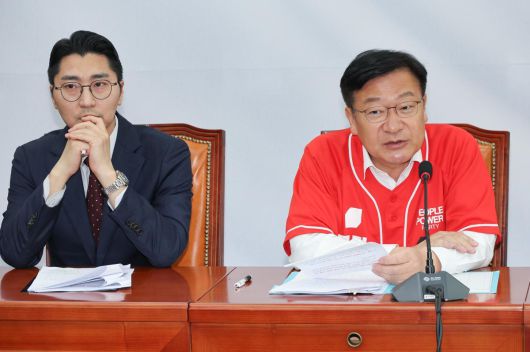 정점식 국민의힘 클린선거본부장이 30일 서울 여의도 국회에서 이재명 더불어민주당 대통령 후보 가족비리 진상조사단 1차 회의를 마친 뒤 백브리핑 모두 발언을 하고 있다. 왼쪽은 박준태 의원. 뉴스1 |