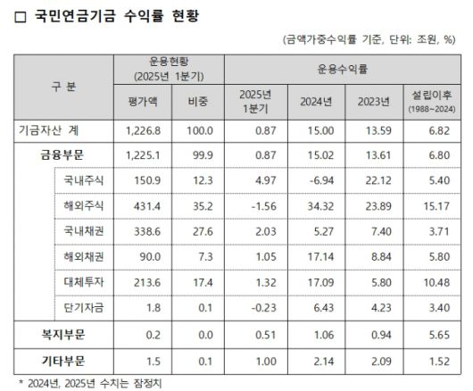 지난 1분기 국민연금 수익률이 1% 미만인 것으로 나타났다. 미국 관세 정책으로 인한 글로벌 경제 불확실성으로 해외주식이 약세를 보였으나 국내주식이 양호한 성과를 보이며 기금 전체 수익률 방어에 기여했다는 평가다.