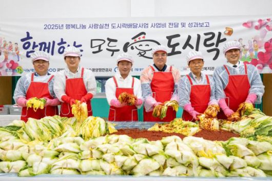 지난 29일, 광양 중마노인복지관에서 박종일 광양제철소 행정부소장(오른쪽 세번째), 정인화 광양시장(오른쪽 네번째) 및 관계자들이 독거노인에게 전달하기 위한 김장김치를 만들고 있다. [사진=광양제철소] |