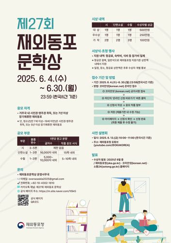 재외동포청은 내달 4∼30일 재외동포 포털사이트 '코리안넷'(korean.net)을 통해 올해 27회를 맞는 문학상을 접수한다고 30일 밝혔다.
