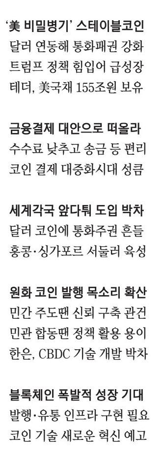 이 같은 위기의식 때문에 국내에서 최근 원화 스테이블코인을 발행해야 한다는 목소리가 높다. 국내뿐 아니라 홍콩, 싱가포르 등 자국 통화를 운용 중인 국가들에서도 자체 통화 기반 스테이블코인을 육성해야 한다는 주장이 힘을 얻고 있다.