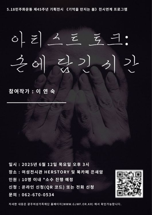 광주여성가족재단은 5·18민주화운동 제45주년 기획전시 '기억을 만지는 봄'의 전시연계 프로그램으로 '아티스트 토크 : 손에 담긴 시간'을 오는 6월 12일 오후 3시, 재단 문화공간에서 개최한다.