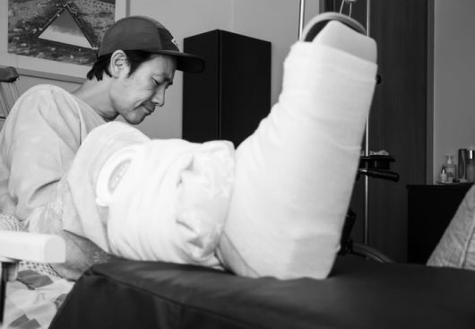 엄태웅은 5월 30일 자신의 SNS 계정에 별다른 멘트 없이 다리에 깁스를 하고 병실에 앉아 있는 사진을 게재했다.