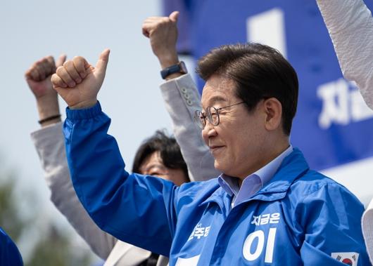 이재명 더불어민주당 대선후보가 30일 오후 강원 춘천시 춘천역 광장에서 열린 집중유세에서 엄지를 들어 보이고 있다. 뉴시스 |
