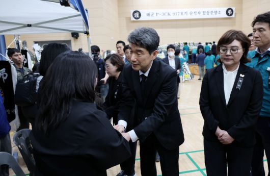 이주호 대통령 권한대행 부총리 겸 교육부 장관이 30일 경북 포항 해군 항공사령부 체육관에 마련된 '해군 초계기 순직자 합동분향소'에서 유가족을 위로하고 있다. /교육부 |