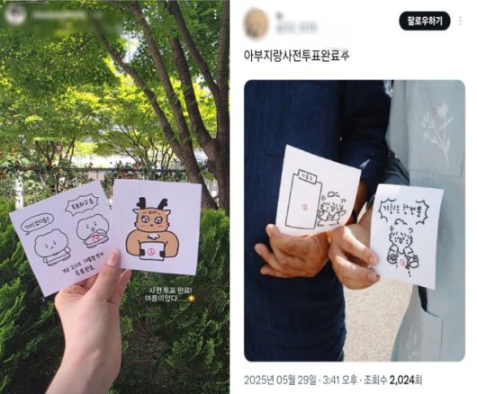 [조윤정기자] 6·3 대통령선거(대선)를 앞두고 지난 29일부터 시작된 사전투표와 함께 인스타그램, 엑스(X·구 트위터), 틱톡 등 SNS 플랫폼에는 다양한 사전투표 인증 콘텐츠가 활발히 올라오고 있습니다. 특히 MZ세대를 중심으로 좋아하는 캐릭터나 연예인을 활용한 투표 인증 방식이 확산되며 새로운 투표 문화로 자리매김하고 있죠. 실제로 인기 캐릭터 지식재산권(IP)인 ‘최고심’, ‘망그러진 곰’, ‘가나디’ 등은 사전투표 일정에 맞춰 자체 제작한 인증 용지 디자인을 공식 SNS 계정에 게시했습니다. 해당 게시물들은 수백에서 수천건에 이르는 좋아요와 공유를 기록하며, 유권자들의 자발적인 참여를 이끌어냈습니다.