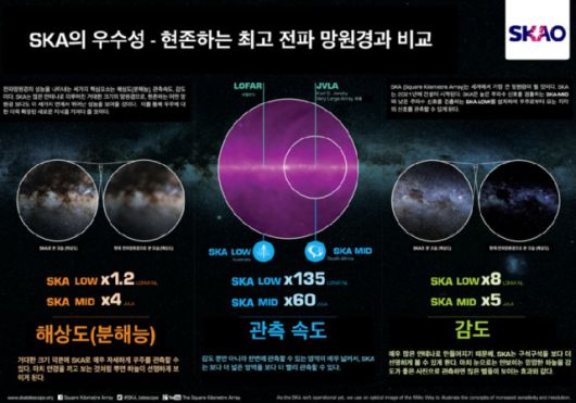 우주청에 따르면 SKA는 기존 전파망원경 대비 해상도, 관측 속도, 감도 등에서 우수한 성능을 지녔다. 우주 초기의 희미한 전파 신호까지 관측 가능해 우주의 기원, 외계 생명체 탐색 등 인류 공동의 난제에 대한 답을 찾는 데 기여할 전망이다. 영국, 남아공, 호주 등 12개국이 SKAO 정회원국으로 참여하고 있다.