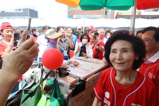 국민의힘 김문수 대선 후보 부인 설난영 여사가 29일 경기도 성남 모란민속 5일장을 방문해 지지를 호소하고 있다. 연합뉴스 |